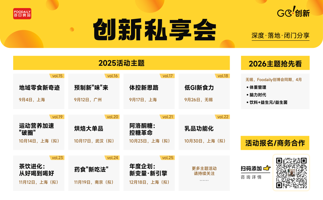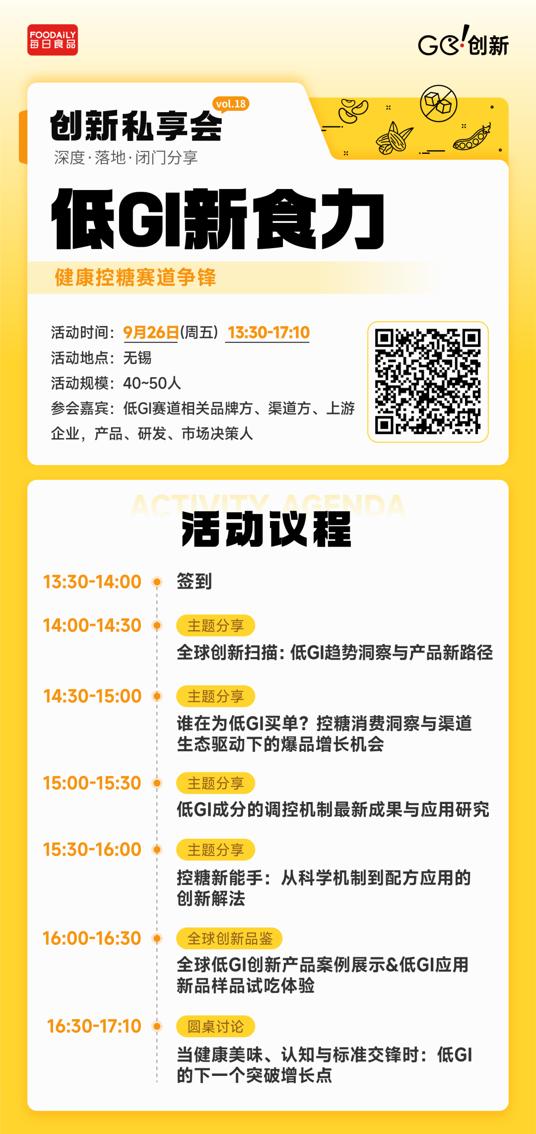 在这一背景下,Foodaily每日食品联合江南大学食品学院董事会,特别策划「低GI新食力,健康控糖赛道争锋」主题创新私享会,将围绕趋势洞察、技术突破、场景渗透、渠道实践等维度展开深入讨论。