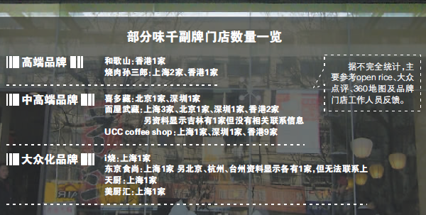 然而北京商报记者调查发现,味千拉面的这十余个副牌的存在感颇低。据不完全统计,高端品牌和歌山在香港有1家门店,烧肉孙三郎在上海有2家门店,根据香港美食指南open rice显示,香港2家门店其中1家已结业。中高端品牌喜多藏在北京和深圳各有1家。在十多个副牌中,面屋武藏是目前可查门店最多的品牌,内地市场中,上海有3家、北京1家、深圳1家,另有资料显示吉林也有1家,但该门店没有相关联系信息;在香港市场上,查到有4家门店,但其中2家显示已经结业;此前可查的澳门1家门店目前在open rice和大众点评上均找不到收录信息。据知情人士透露,UCC coffee shop在香港也有近半门店结业,而在国内市场也只有2家门店,且有消费者表示,服务和产品远不及香港门店。而此前报道中提到的味牛和麻布十番等,open rice收录的麻布十番2个门店均已结业,内地市场也未查到相关门店信息,味牛在内地市场也没有查到门店信息。