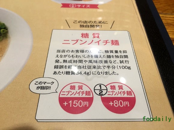 100 克的赤丸也改为 70 克,10 只一份的“一口饺子”在经过 1/2 化之后(原本售价 500 日元),也变成五个,售价 270 元。另外,这家店的面条都可以替换成低糖的版本,100 克面条含糖量仅为 34.4 克。对于吃拉面通常要加面的人来说,简直是反其道而行之。