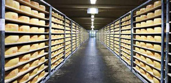 首先装满奶酪的货架被运送到指定区域,1台R-2000iC/210F机器人负责将奶酪搬运到输送带上。R-2000iC含有6个运动轴适用于动作略复杂的码垛搬运作业,搭配特制手抓,机器人可一次搬运3块重约54公斤的奶酪。