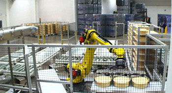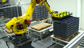 最后,装满奶酪的箱子被传送到码垛区,由多台R-2000iC/210F机器人来完成对成品的码垛。