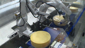 Norrmejerier是一家位于于莫奥的乳品厂,在这里西博滕奶酪会被重新包装并销往世界各地。由于市场需求逐渐增大,2016年Norrmejerier引入了自动化线来应对每周约200吨的奶酪的包装作业。包装线由14台,5种不同型号的FANUC机器人组成。机器人充分发挥各自特点完成拆垛、去包装、整列、装箱、码垛的一系列工作,并成功地将整线产量提升了40%。