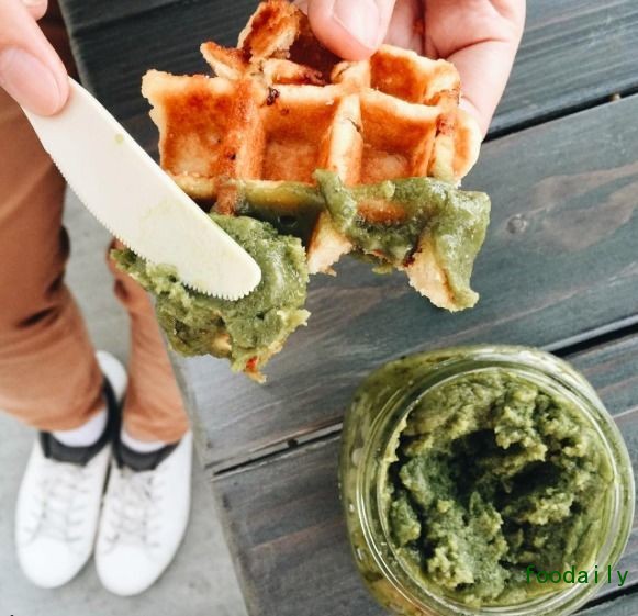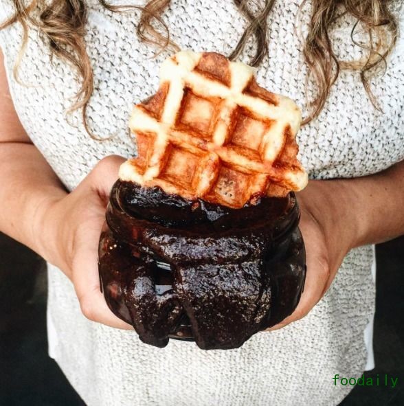 作为一家甜品店,The dirty cookie 不只售卖让你一口闷的 The Cookie Shot,它还做了多味黄油饼干,根本没有饼干的形状,就是一大坨糊糊。有抹茶味、奥利奥奶油味、红丝绒味,吃法就是用华夫饼沾着吃。