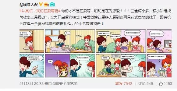 “卖萌+吃货+美食+搞笑”对于80、90后来讲,永远都有说不尽的话题和素材,而三全萌粽则将这几个关键词,牢牢的与产品进行捆绑加持,从粽子到品牌能一直保持热议不断!