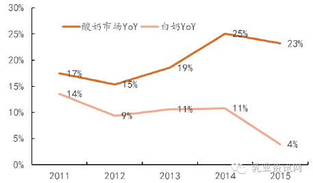 国内市场,酸奶产品已占液态乳行业三成份额。2013 年,在三大乳企都推出常温酸奶产品后,酸奶更是以白奶两倍的增速,于2015 年迅速突破800 亿元,占液体乳市场的3 成。
