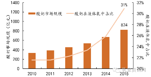 2010-2015 酸奶的市场规模以及在液体乳中占比