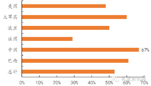 中国消费者更加青睐酸奶产品。虽然过去三年里世界各地的酸奶需求均出现了增长,但中国的增幅遥遥领先。在中国,67% 的受访消费者表示目前食用酸奶的数量多于三年前,而其他国家这一比例仅为50%(巴西、法国、波兰、土耳其和美国)。