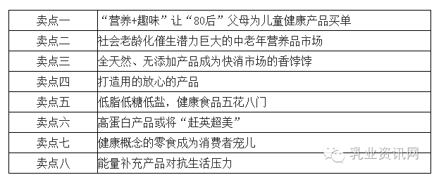 酸奶产品符合消费者健康趋势。尼尔森在2014 年总结了健康消费的八大卖点。酸奶产品能轻松迎合其中五个卖点,甚至更多。