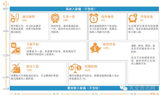 4、收入不再决定年轻一代消费水平。根据埃森哲的研究,现代中国消费者大致有8 种分群刻画。与老一辈不同的是,年轻一代的消费观念已经不再与收入水平直接挂钩。稍有一定经济能力的“豁达工薪”人群就拥有前卫的消费观念,注重便捷和享受。收入更高的“互联平民”、“潮流新贵”和“乐享一族”就更不在话下了。酸奶符合当下潮流,食用方便,口味清新独特,也有助于控制体重,作为新一代的零食和甜点最合适不过。老少皆宜,酸奶消费人群更广。所谓再苦不能苦孩子,就算是相对低收入的“勤俭持家”型中年人群也非常注意子女的健康和营养。酸奶产品在这方面独有的优势也吸引着这一群消费者。手头充裕的中年群体(“服务尊享”和“传统安逸”)通常面临一系列亚健康问题。酸奶针对亚健康人群的健康益处(尤其是调整肠胃)也能吸引想对自己好一点的这群消费者。