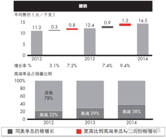 5、随着中国人口消费升级,同类酸奶价格(以及利润率)不仅持续增长,层出不穷的高端品类更是推涨了酸奶整体均价。从2012-2014 年,酸奶单价年均增长13.5%,其中7%-9%来自于高端产品的推出和普及。