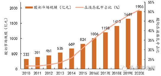 2020 年酸奶市场规模将达1900 亿,占据液态乳行业50%。从2010-2015 年,酸奶市场经历了高速增长期,复合增长率高达20%,并于2015 年超过800 亿元。
