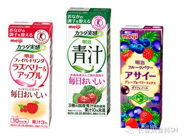 明治还开展了低果汁产品,打算主打“健康感”来使产品差异化。例如:调整肠胃的特保食品“纤维饮品玫瑰果&苹果”、“青汁”;使用了超级水果的“巴西莓 葡萄&莓类mix“”巴西莓 火龙果&苹果“都是主打健康概念的饮品。