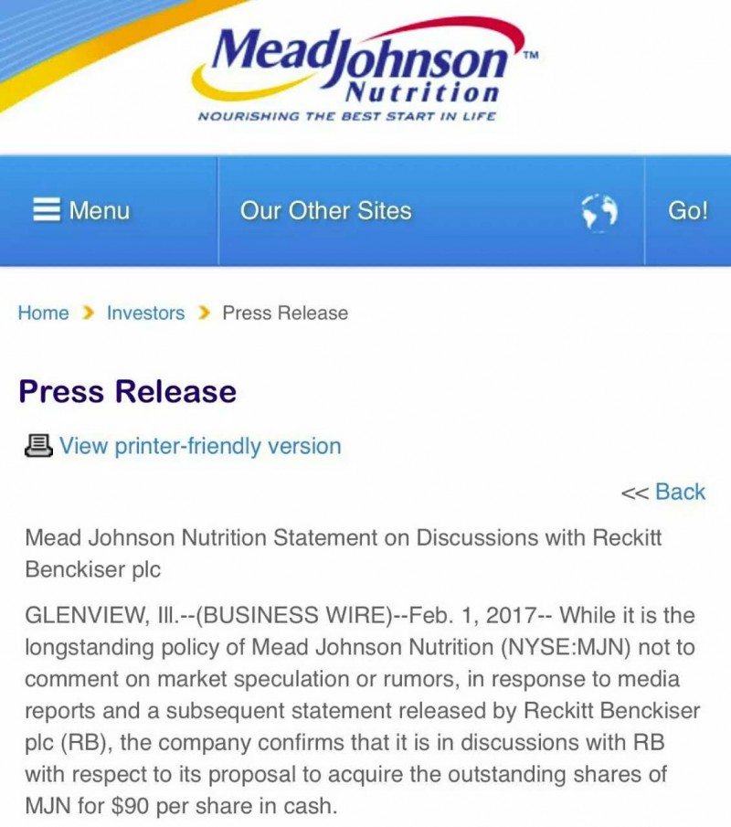 美赞臣随后在纽交所给出的通报指出,尽管公司长期以来的政策是不评论市场传言,不过鉴于媒体的报道以及利洁时的发出的声明,美赞臣确认,利洁时提出以每股90美元现金的价格对其发起收购。