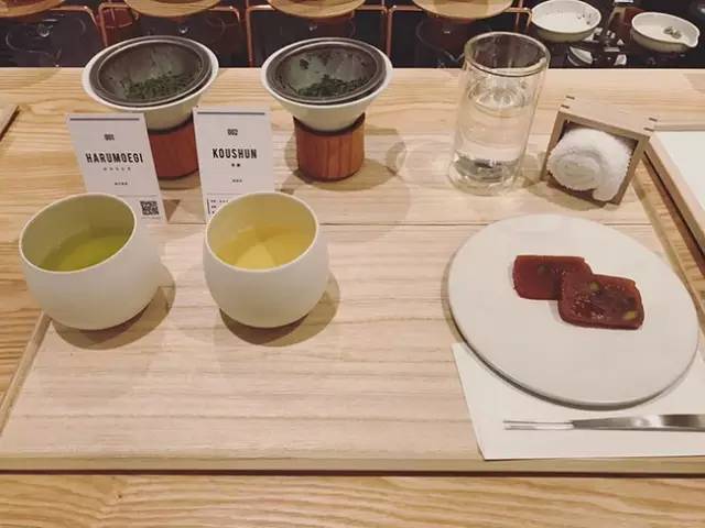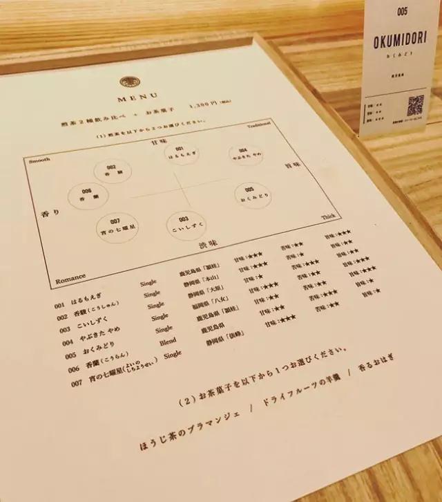 菜单简单清楚地列出店内所提供的七种茶品,并将每一种茶的甜味、苦味以及香气等以星星标示,即使平时对喝茶较少研究的顾客也能轻易想象味道,选择时更加轻松方便。另外,店内也提供三款日式点心,焙茶奶酪、水果干羊羹、日式萩饼,可供搭配成套餐。