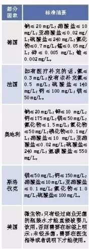 北京大学公共卫生学院营养与食品卫生系主任马冠生指出,婴幼儿由于代谢系统还在发育,因此饮用水矿物质含量不能过高,美国、欧洲等发达国家都制定了完善的婴幼儿饮用水标准(见附表),因此建议针对婴幼儿特殊人群,我国应当参照国外发达国家尽早制定相应的标准。