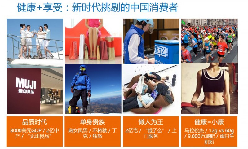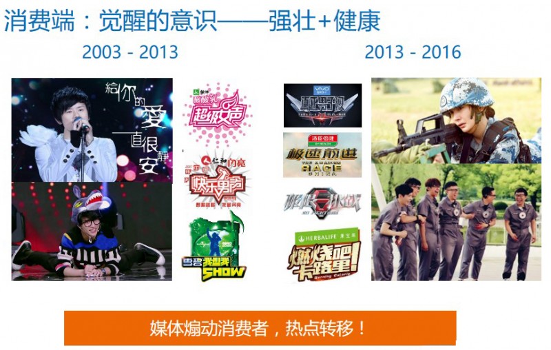 伴随着中产阶级、00后市场的发展,中国消费端的意识觉醒主要集中在强壮和健康方面。随着时间的前进,以前流行的一些东西慢慢的转变为不流行,而新的流行趋势开始逐步出现。中国消费者受媒体的影响非常大,而媒体也是紧跟消费者内心最根本的冲动和趋势。中国创新和变革发展较快,特别是国民对西方文化跟进的速度,是难以想象的。