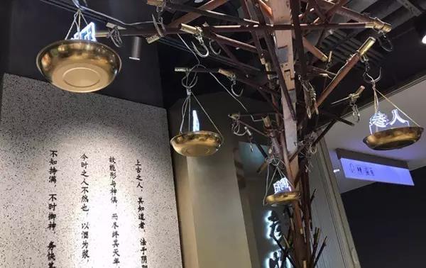 门店设计与王老吉保留具有标示性的红色不同,彦悦山走目前较为主流的简洁风,主打色清新文艺,与品牌名相互辉映。装饰于墙顶与墙壁的根木、秤杆、秤盘,以及道家文字,又添了几分清雅。