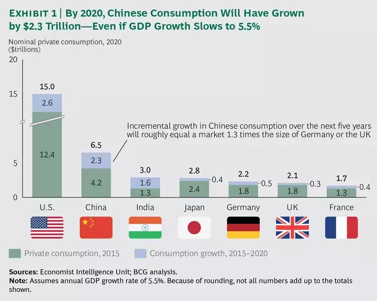 ▲ 图1:到2020年,中国消费者市场增量达2.3万亿美元