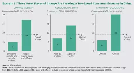 其关键发现是:一个“双速”的消费者经济正在中国涌现(参见图2)。高收入人群、年轻一代以及电子商务渠道均出现了高增长,但低收入、老龄消费者及传统零售渠道的消费增长则在减速。