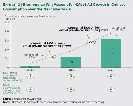 波士顿咨询集团与阿里研究院的联合研究发现,这三股变革力量在未来将深刻重塑中国经济与消费者市场。到2020年,81%的消费增长将来自年收入超过24,000美元的家庭。此外,35岁及以下的年轻消费者将贡献增长的65%。电子商务将成为更重要的零售渠道,推动42%的总体消费增长,而90%的电子商务增长将来自于移动端。
