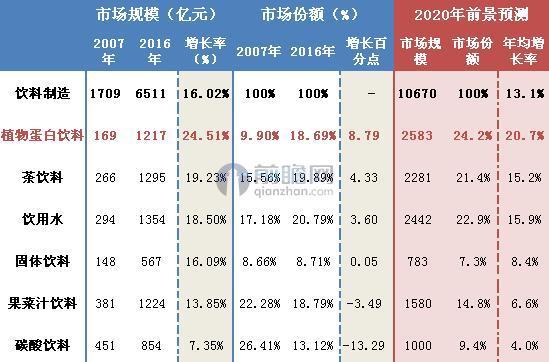 前瞻产业研究院分析认为,随着碳酸饮料及含乳饮料行业面临产品品种老化、渠道表现力弱、消费群体单一、安全问题频发等瓶颈的拖累,饮料市场继续向植物蛋白饮料、茶饮料、饮用水等“健康”饮料方向发展,植物蛋白饮料行业未来几年的增速将有望保持在20%以上,领跑整个饮料制造市场,预计到2020年植物蛋白饮料市场规模达2583亿元,占饮料行业的比重继续上升至24.2%。