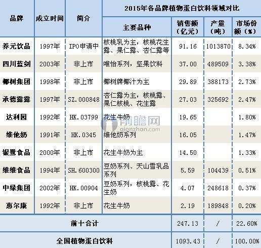 但从杏仁露、椰子汁、核桃露等细分领域来看,椰树“椰汁”、露露“杏仁露”、养元“六个核桃”、银鹭“花生牛奶”等领导性品牌均占据了一半以上的份额。