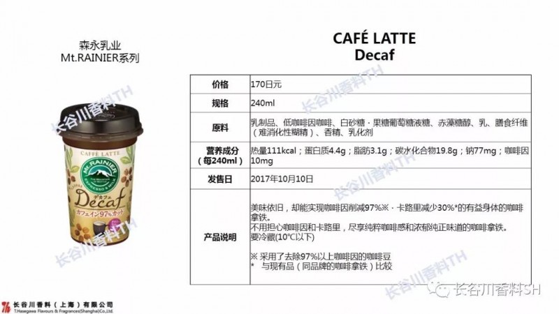 CAFE LATTE Decaf —— 最近Decaf的概念盛行。这款咖啡在保持风味的同时,咖啡因减少97%,热量减少30%,健康无负担。