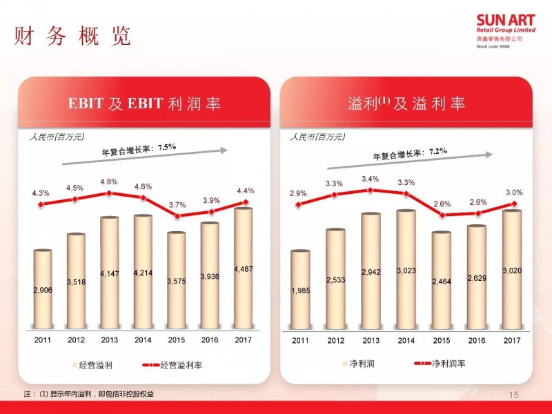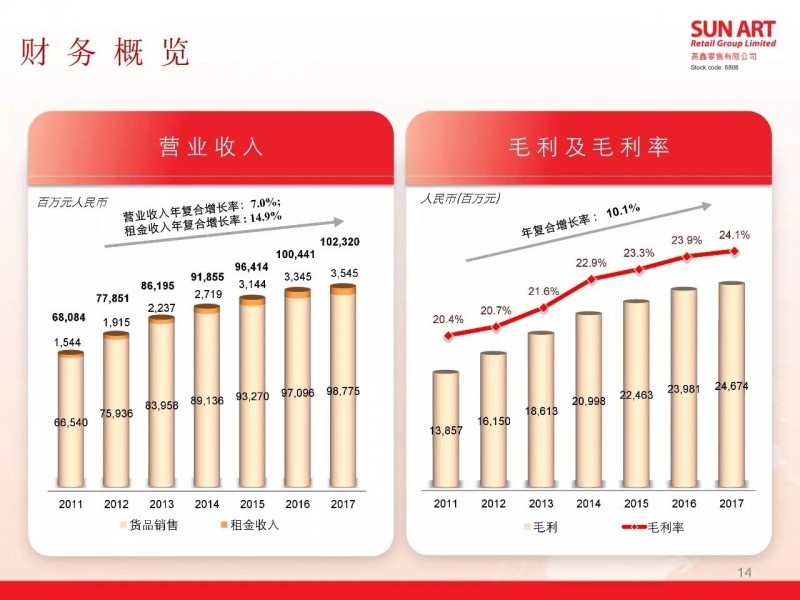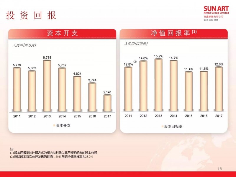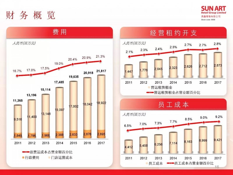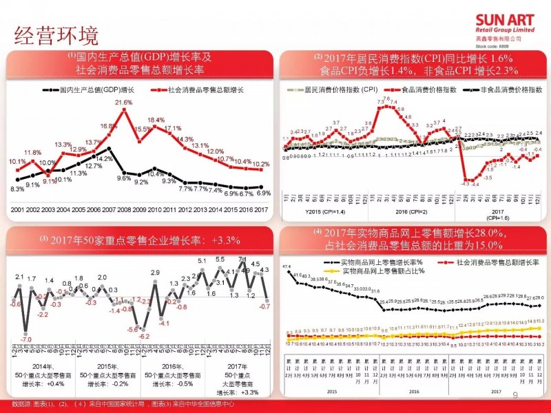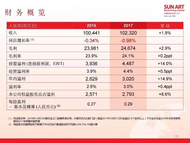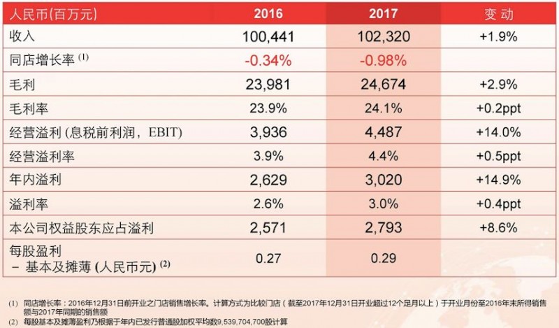 财报数据显示,高鑫零售2017年营业额为1023.2亿元,同比增长1.9%;销售货品所得营业额为987.75亿元,同比增长1.7%;毛利246.74亿元,同比增长2.9%;净利润27.93亿元,同比增长8.6%。虽然各项数据都有增长,但增幅均不明显。同时,高鑫零售2017年同店销售下跌0.98%,而去年同期为下跌0.34%。