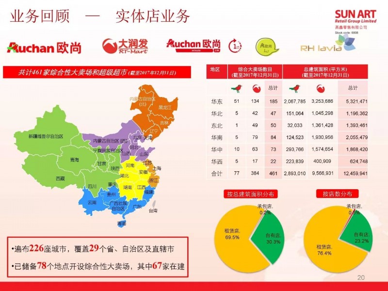截止2017年12月31日,大润发门店达到384家,欧尚门店为77家,合计461家。其中,约8%位于一线城市,17%位于二线城市,45%位于三线城市,22%位于四线城市,8%位于五线城市。