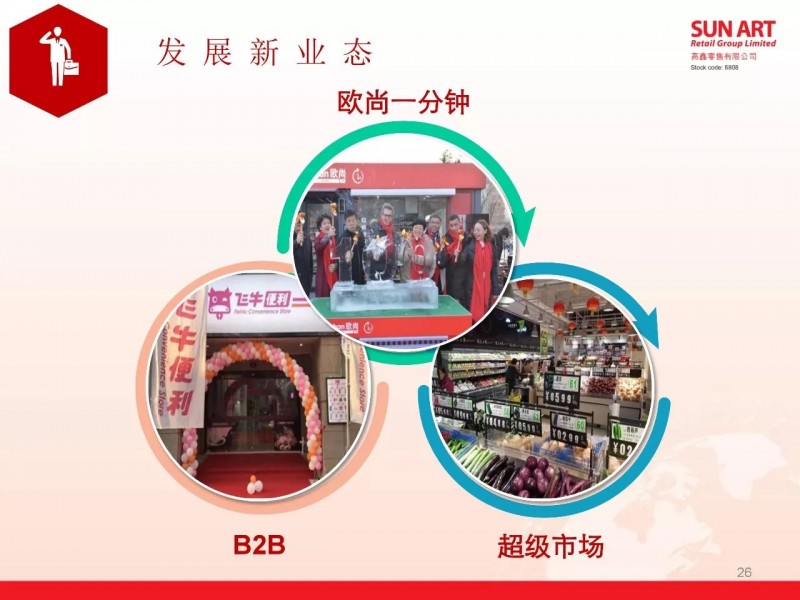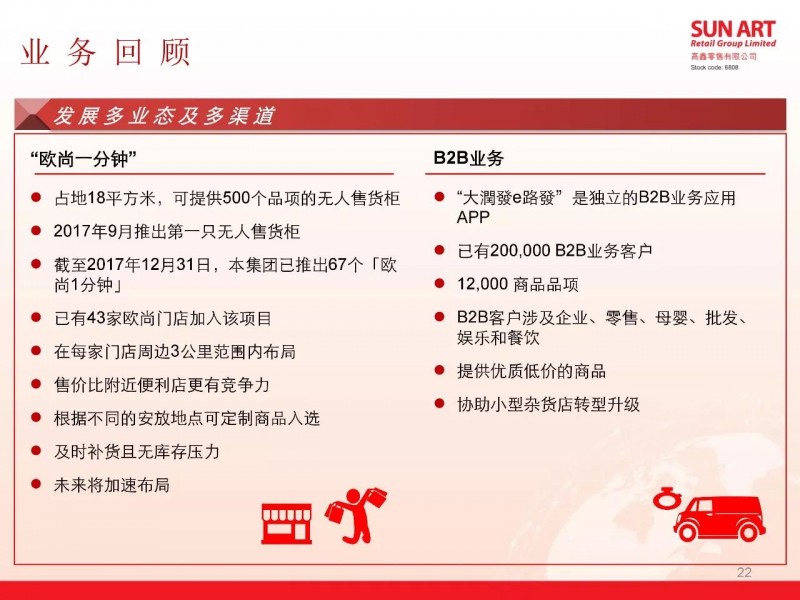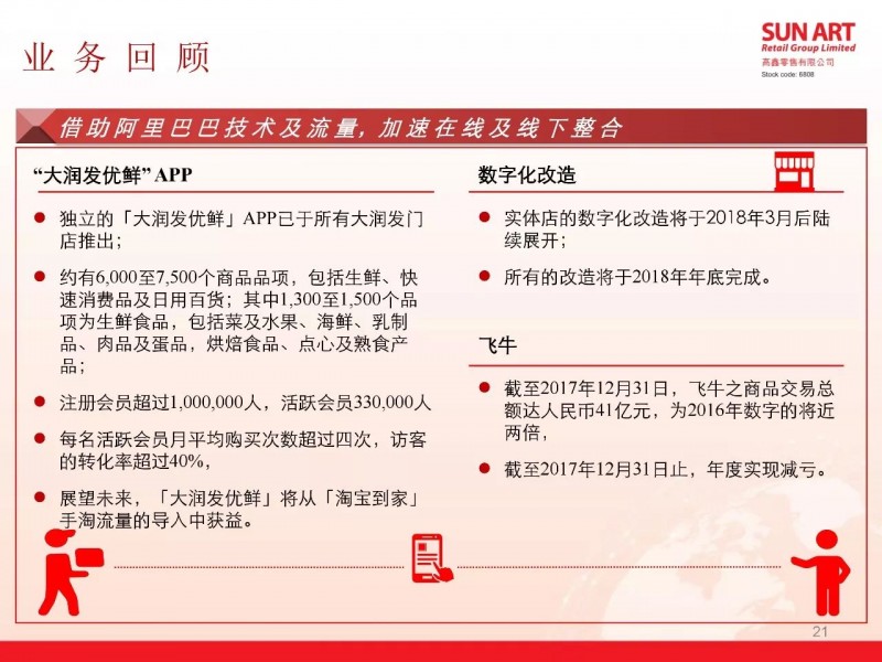此外,第一家Hi!Auchan高端超级市场的销量及顾客人数相较于2016年均增加超过30%;飞牛将其重心转至业务对业务(B2B),2017年B2B业务的销售贡献占飞牛商品交易总额的60%,旗下APP“大润发e路发”拥有约20万名B2B客户及超过1.2万个品项。
