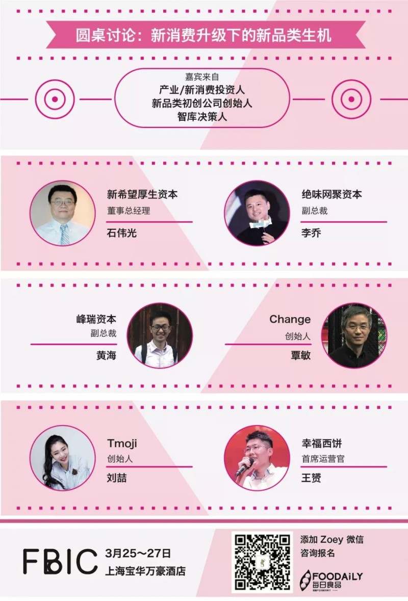 如何发现新零售下的新品类商机?在“2018全球食品&饮料创新品鉴(FBIC)"活动中,Foodaily有幸邀请了来自新希望厚生资本、峰瑞资本、绝味网聚资本的产业/新消费投资人,以及定位健康减脂的Change酸奶、主打草本饮料的Tmoji、烘焙新锐品牌幸福西饼等新品类初创公司的创始人和智库决策人将共同与大家探讨: