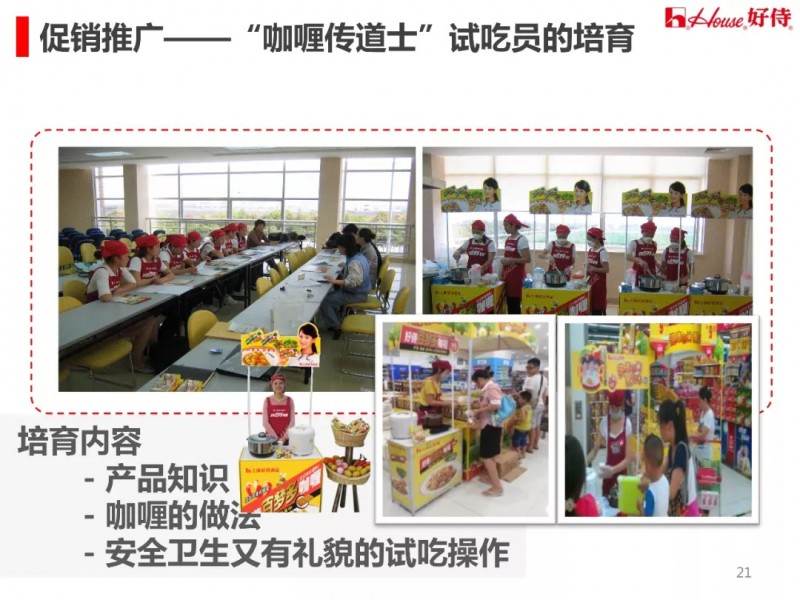 同时好侍认为对于尚未被认可的产品来说,最重要的是让消费者接触品尝并产生购买欲望。因此好侍培训了多名产品促销员,进入商超开展试吃活动,并通过这些‘咖喱传道士’来普及咖喱的做法、产品知识等等。