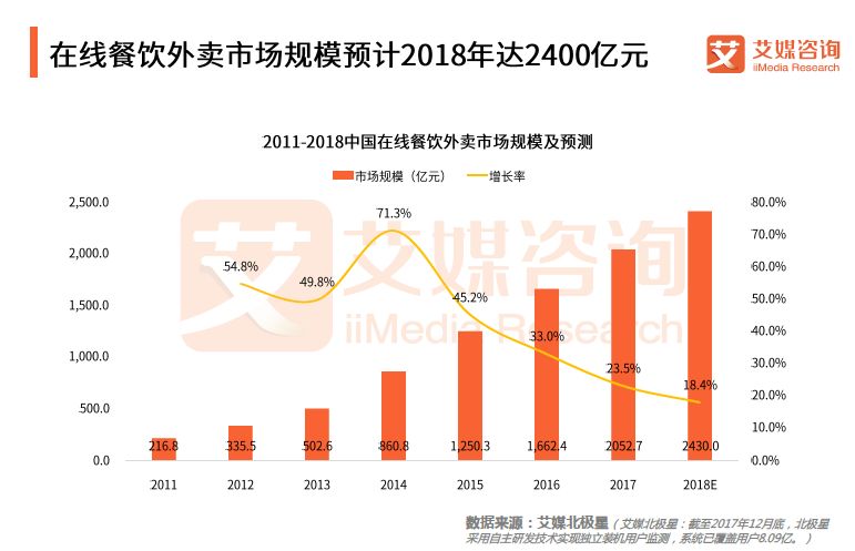 在线餐饮外卖市场规模预计2018年达2400亿元