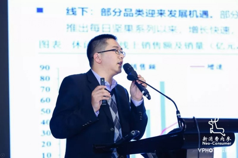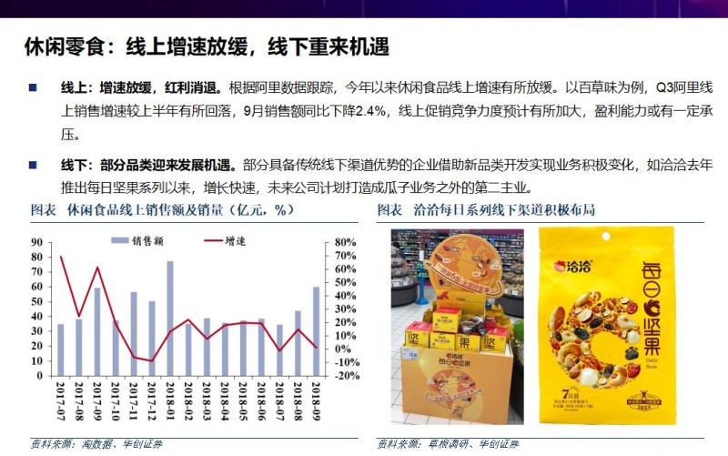 休闲食品行业是这几年食品饮料领域创新最多的,也创造出来了很多新的公司,比如说三只松鼠、百草味、良品铺子。2012年开始,整个行业线上红利非常大,线上增速非常快,但是这一、两年稍微有所放缓了,现在开始讲新零售了,线下重新有了机遇,线上的一些企业重新开始布局线下。