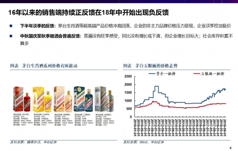 从销售端来讲,2016年到2018年持续正反馈,不断地超出预期向好,但是在2018年年中开始出现了一些负反馈。负反馈是从哪里开始?白酒里面是从投资、收藏茅台生肖酒开始,价格从年初的2300块钱,涨到了最高4500块钱,最近又跌到2500、2600块钱,稳定在2700块钱的水平。