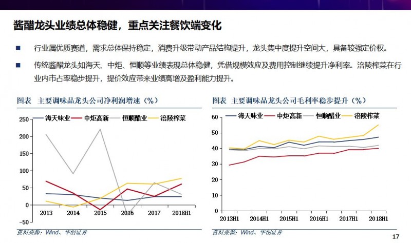 目前来讲,总体比较稳健,建议大家关注餐饮端的变化。因为在调味品里面,餐饮使用量是最大的,一瓶醋在餐饮店和在家里使用的速度完全不一样,餐饮端的变化可能会对行业的业绩产生一定的影响。但是今年年内目前来看,基本上还是没什么问题,下半年可能会稍微弱一点儿。