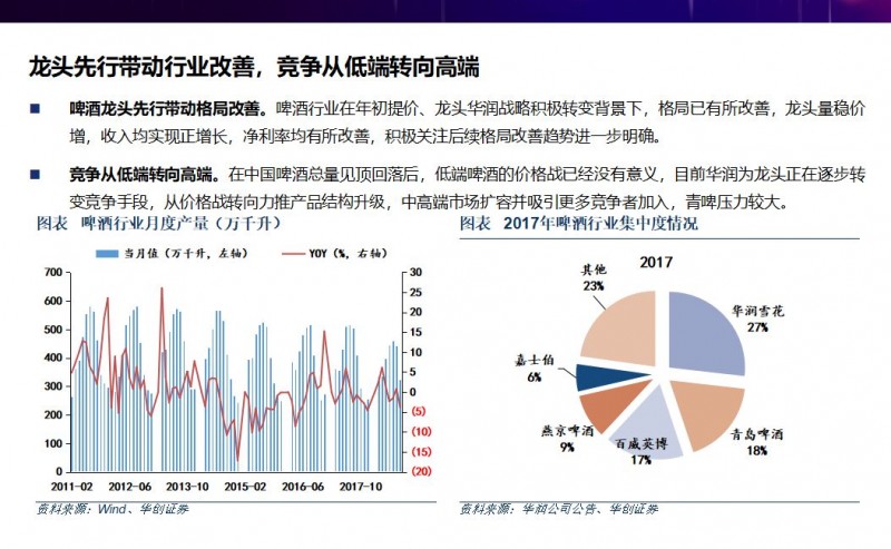 但是,这几年,啤酒行业已经开始从格局上进行改善了,因为低端的价格竞争无以为继了,行业的产量开始负增长,再打都没用了,就不再打价格战了,开始走向中高端的发展。