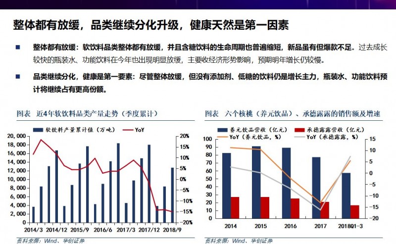 目前为止,整个软饮料产量的数据现在开始已经负增长了,尤其是一些碳酸饮料,常温的果汁饮料、茶饮料,都开始零增长、负增长了,都开始变老了,消费者不再追求了,消费者追求的是新鲜的、健康的、天然的东西。