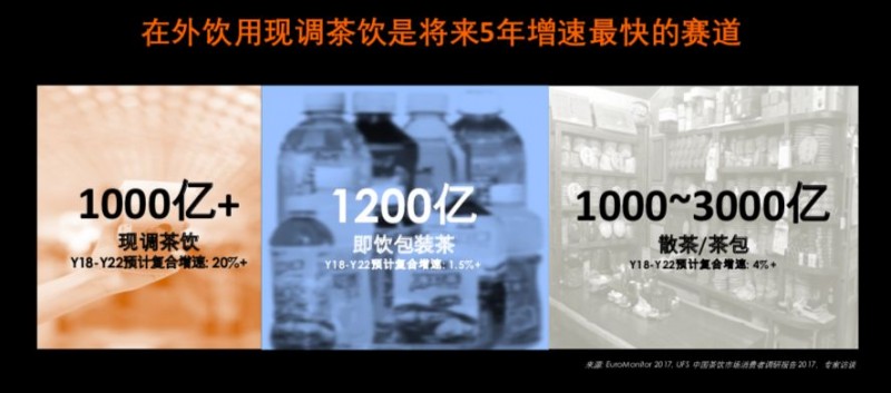茶饮市场不光是各位的茶饮店,是中国人喝茶的整个市场,它是个很难统计的数字。这里有三种饮茶方式:最难估的1000-3000亿,主要指散茶或茶包的市场;中间1200亿这块是即饮包装茶,以康师傅统一为代表,有很大的存量;第三块现调茶饮的容量在1000亿+,具体的精度并不重要,重要的是大家看到这三列,立顿都有涉足。