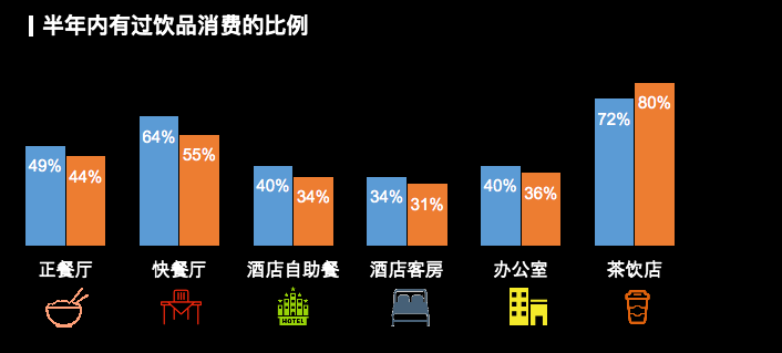 但在左边的场景里面,有的饮品消费场景比例在下降。什么意思?很多的消费者拿了一杯茶饮店的茶,跑到快餐店只点一个正餐、汉堡,对快餐厅、正餐厅是利润的损失,他们也在想办法反击,但是场景确实在转变。