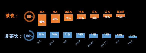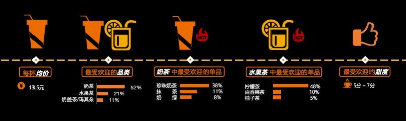 平均每杯价格是13块;奶茶中最受欢迎的单品有珍珠奶茶、抹茶、奶绿;水果茶中,柠檬茶是最大的品类,百香果、柚子是这几年增长最快的品类;甜度是5-7分。