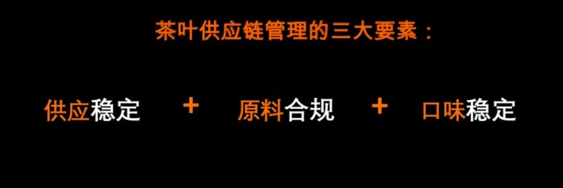 谈到供应链,这里分享三个我们觉得在茶叶供应链方面比较标准的注意点,如果这三个注意到了,基本上你们的茶叶品质就不会有很大的问题——产品供应的稳定性、原料的合规性、口味的稳定性。