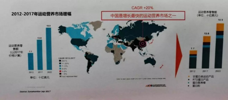 随着国民健康意识的不断深入和全民健身活动的推进,中国运动营养市场的规模日趋扩大。2018年,中国运动营养市场整体规模为3.29亿美元,在过去的五年中,产业零售额的复合年均增长率高达40%,增速高于全球和美国市场。