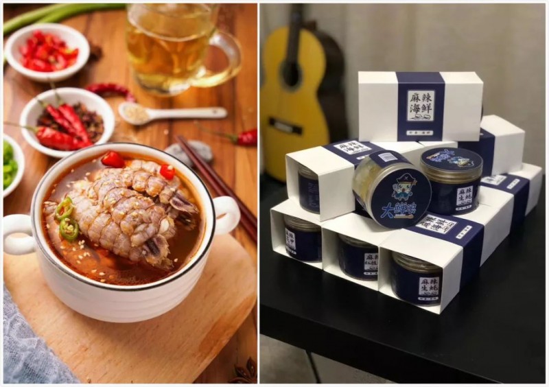 大鲜浪目前有十多个 SKU,不同于市面上其他品牌大多选择“锁鲜装”包装,大鲜浪选择罐装密封、不添加防腐剂、-18℃冷冻保存、解冻开盖即食。在口味方面,大鲜浪做的是捞汁海鲜,要点是强调“鲜”,不会加入过重的卤味,以麻、辣去除腥味并产生一定的“成瘾性”。在产品创新方面,每月会推出新品淘汰低销量产品,目前的产品线有涝汁小海鲜、蒜蓉小海鲜、花胶粥、佛跳墙和即食燕窝漱口水。
