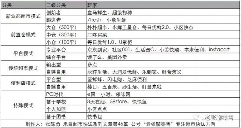 本文对超市快送分类成:新业态超市模式,前置仓模式,平台模式,传统超市模式,便利店模式,特殊模式。并且点评了这六大模式。