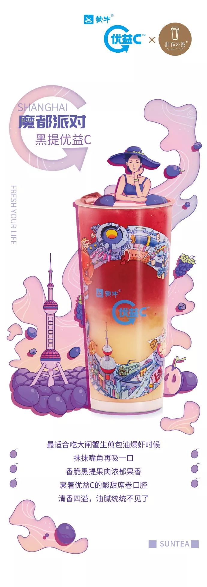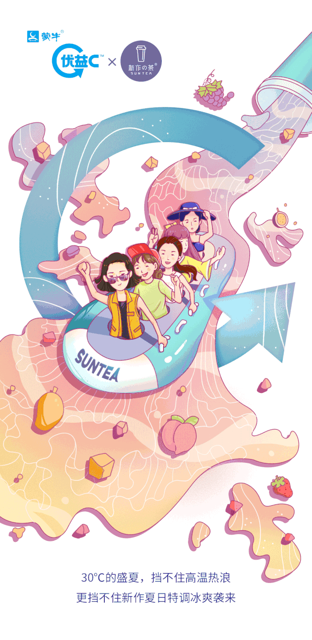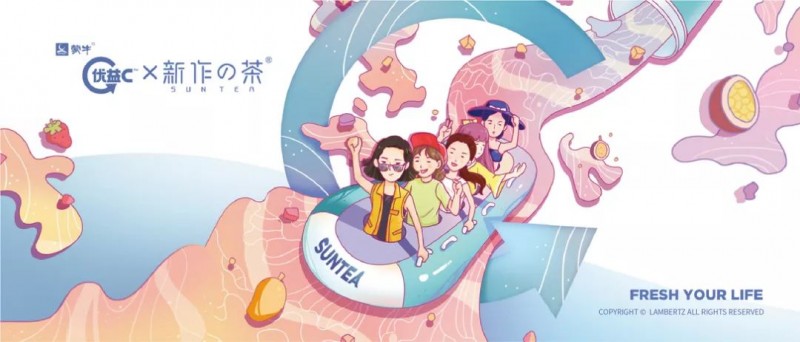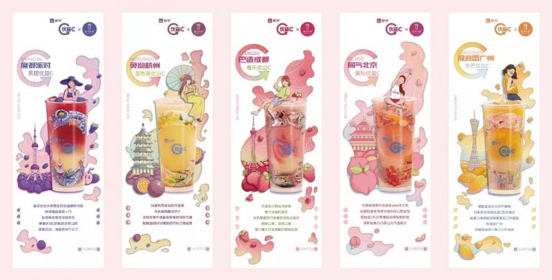 优益C和新作的茶进行联合设计,属于同类行业的品牌合作,充分发挥各自产品的优势。借以五位不同的女性形象去代表五个城市,用粉嫩、少女心的设计,迎合了更多的女性消费者的需求,推出了独有的城市特饮,为品牌注入了独特的视觉符号和标签。