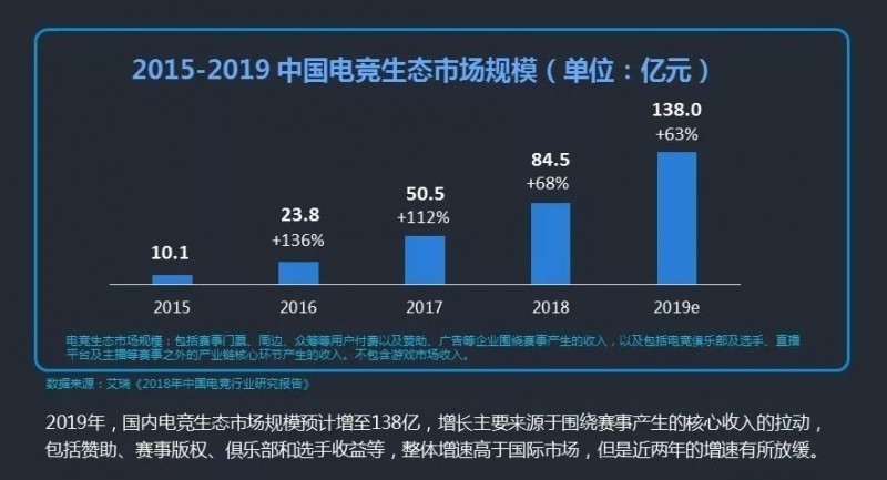 此外,2019年被视为全球电竞市场的一个重要里程碑,全球电子竞技市场规模首次超过10亿元,同比增长26.7%。而根据艾瑞咨询《2018年中国电竞行业研究报告》显示,2019年,国内电竞生态市场规模预计增至138亿,整体增速高于国际市场,但是近两年的增速将有所放缓。与此同时,伴随着电竞的出圈和大众化普及,中国的电竞用户基础也进一步扩大,2019年,中国电竞用户将达到3.5亿,同比提升10.6%。