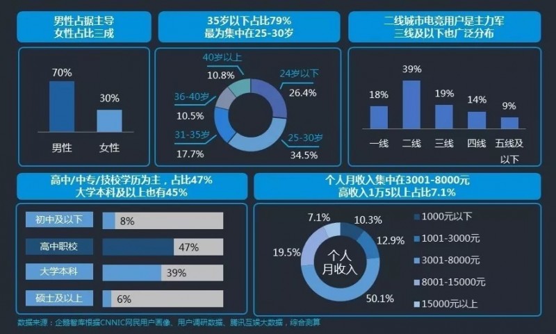 根据企鹅智库的测算,中国的电竞用户也有了一个具化的画像:年轻、学历偏高、收入高。其中男性以70%的比例占据主导,35岁以下的用户占79%,且最为集中的在25-30岁间;二线城市电竞用户成为主力军;大学本科及以上学历的用户占比45%;且这些用户月收入高,集中在3001-8000元,1.5万以上收入的也有7.1%。