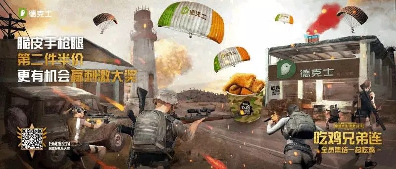 去年8月,全家、德克士正式宣布与热门手游《绝地求生》达成年度官方合作。合作覆盖全家、德克士全国5000家门店,推出系列主题商品,联动游戏内外资源,对接虚拟与现实世界,全方位营造" 吃鸡 " 氛围,开创国内首例横跨零售、餐饮、游戏多业态的全新合作模式。消费者除了在门店参与活动,还可在游戏内完成任务领取全家、德克士限量版道具及优惠券,享受游走于虚拟和现实的超凡体验。