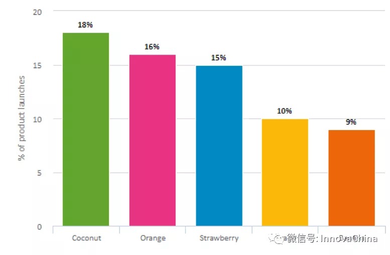 Innova全球新品数据库在2018年追踪到的所有含有超级水果的食品饮料新品发布中,应用前五位水果分别是椰子,橙子,草莓,葡萄和香蕉。